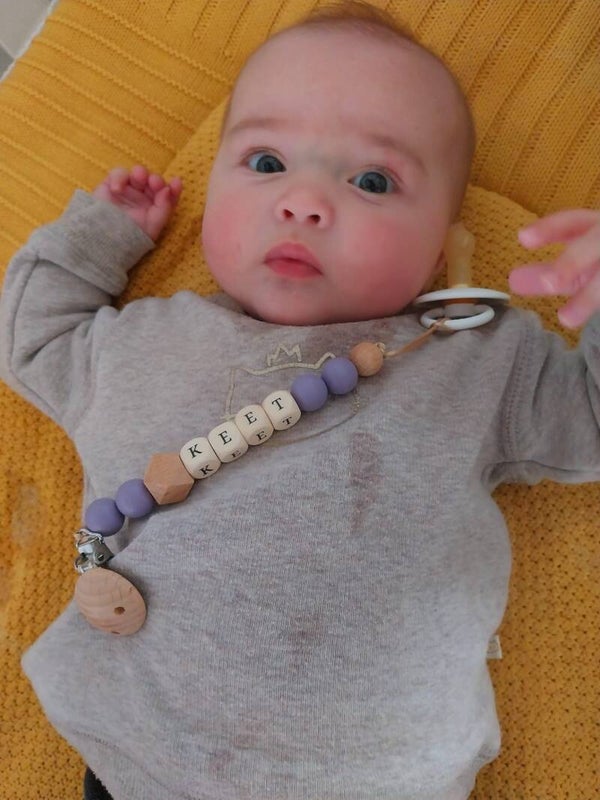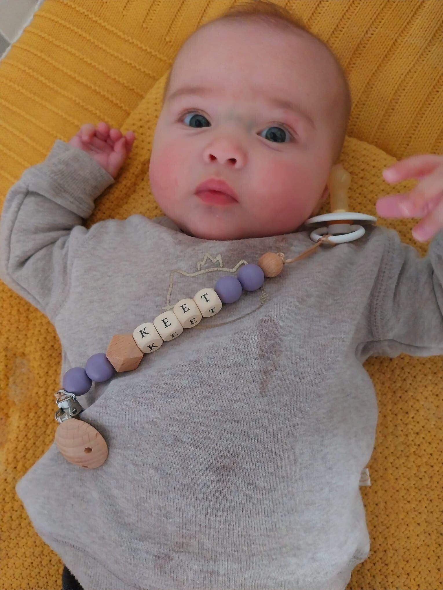 De lengte van de naam bepaalt hoeveel kralen we nog kunnen gebruiken. Hierdoor kan het speenkoord iets afwijken van het origineel. Is de naam langer dan 5 kralen, gebruiken we kleinere houten letterkralen. We zorgen altijd dat het in dezelfde stijl blijft!